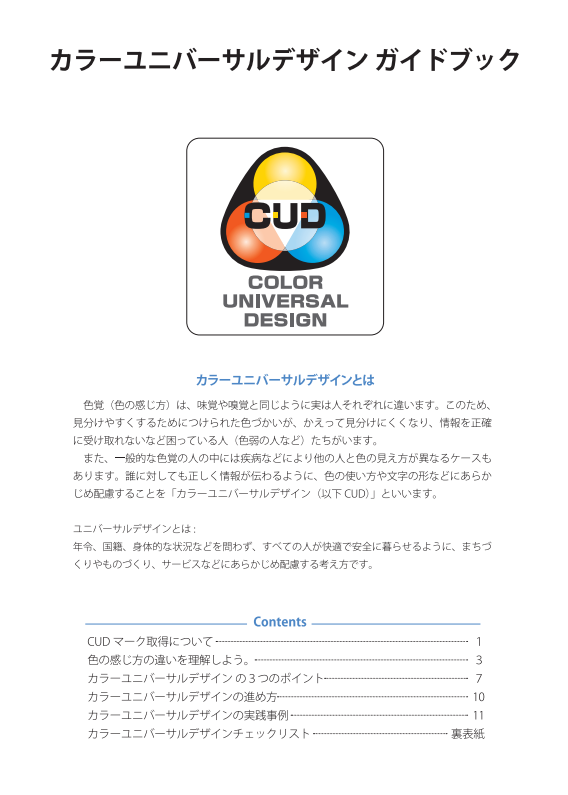CUDマーク取得の基本的な流れやCUD検証の評価ポイント、CUDの取り入れ方と進め方について「カラーユニバーサルデザイン ガイドブック」にまとめましたのでご活用ください。